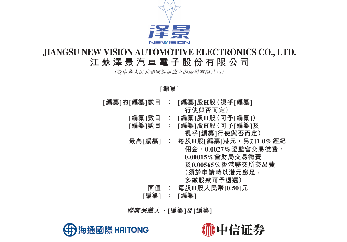 据港交所官网,5月9日,江苏泽景汽车电子股份有限公司(以下简称“泽景电子”)提交上市申请,联席保荐人为海通国际、中信证券。