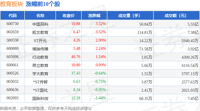 证券之星消息,11月26日教育板块较上一交易日下跌0.91%众合网,科德教育领跌。当日上证指数报收于3864.18,下跌0.15%。深证成指报收于12907.83,上涨1.02%。教育板块个股涨跌见下表: