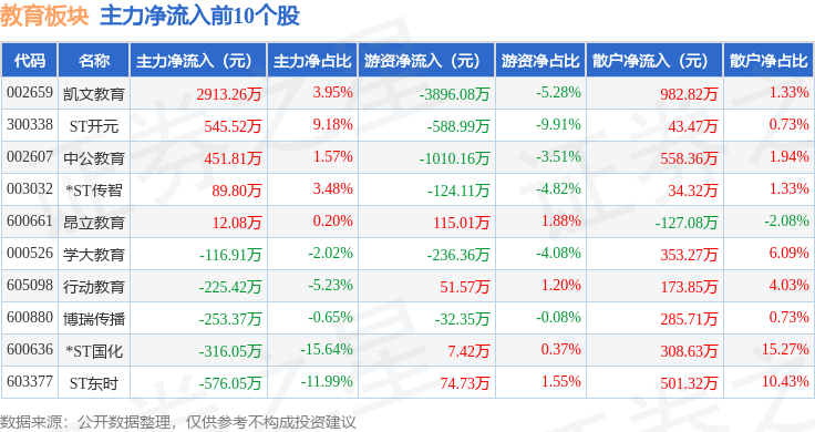 从资金流向上来看,当日教育板块主力资金净流出3.95亿元,游资资金净流入4317.08万元,散户资金净流入3.51亿元。教育板块个股资金流向见下表: