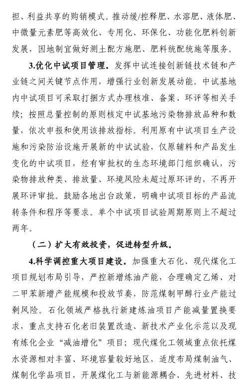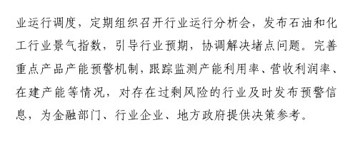 加强重大石化、现代煤化工项目规划布局引导,严控新增炼油产能,合理确定乙烯、对二甲苯新增产能规模和投放节奏,防范煤制甲醇行业产能过剩风险。