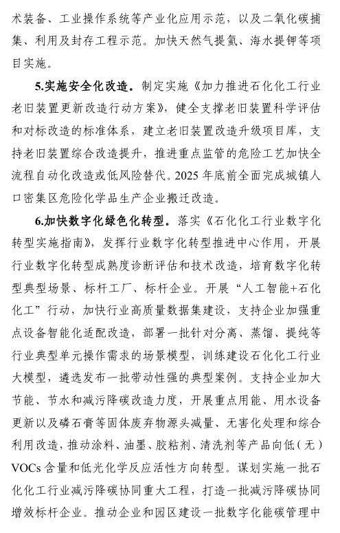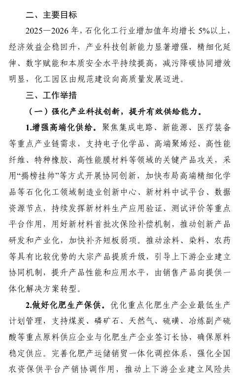 方案提出主要目标:2025—2026年,石化化工行业增加值年均增长5%以上,经济效益企稳回升,产业科技创新能力显著增强,精细化延伸、数字赋能和本质安全水平持续提高,减污降碳协同增效明显,化工园区由规范建设向高质量发展迈进。