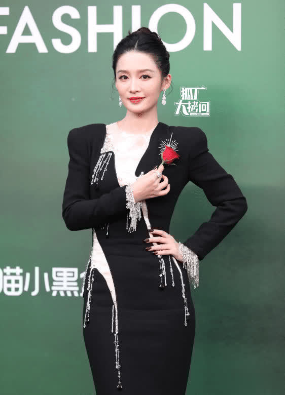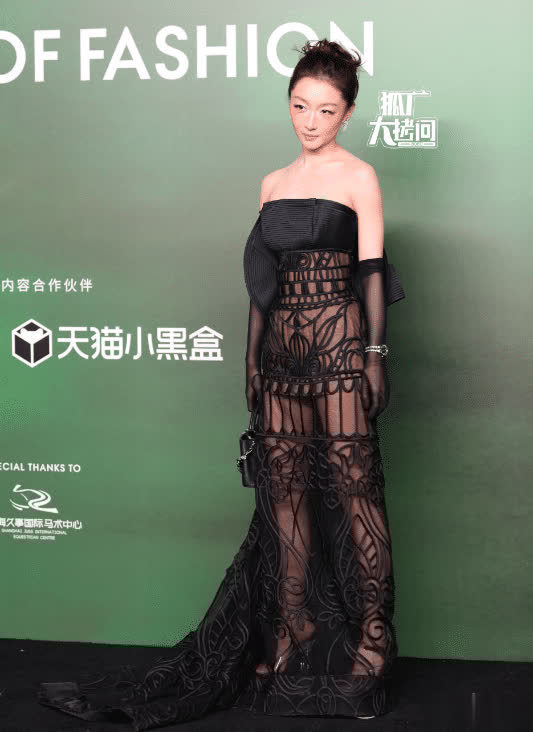 这次她一身黑色短款礼服,从胸口蜿蜒到背部的黑纱像是花瓣,颇有设计感。