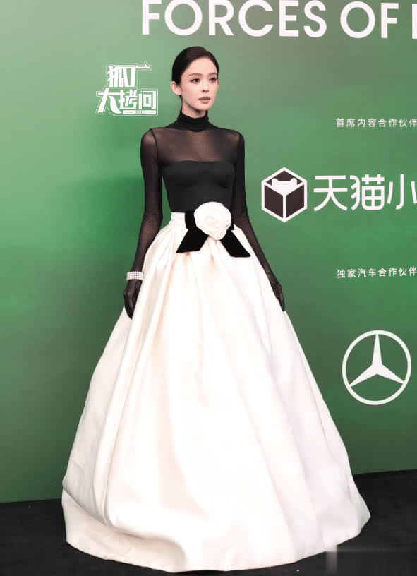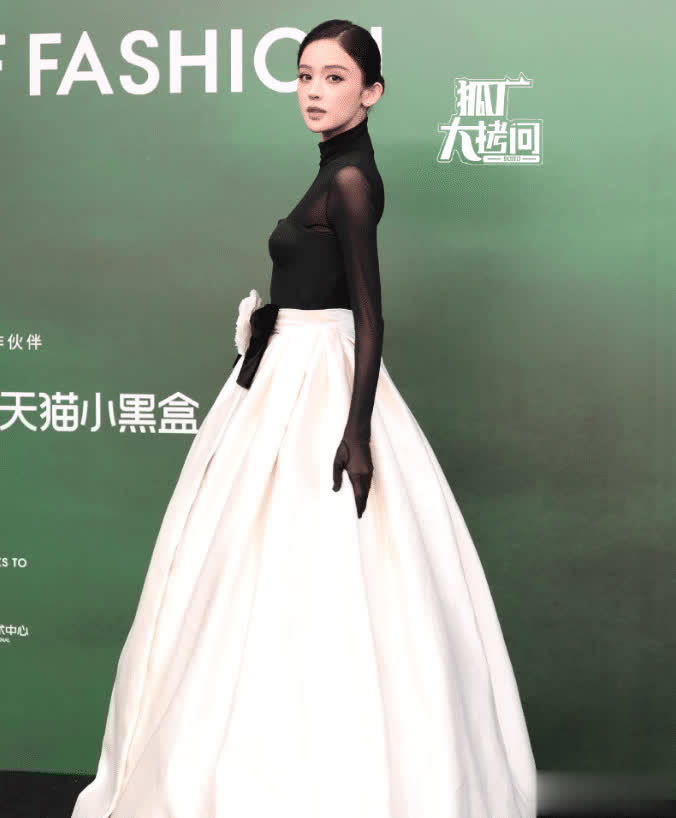 黑色纱质上衣轻盈,搭配白色缎面长裙,低盘发的造型优雅,像是一朵行走的山茶花。