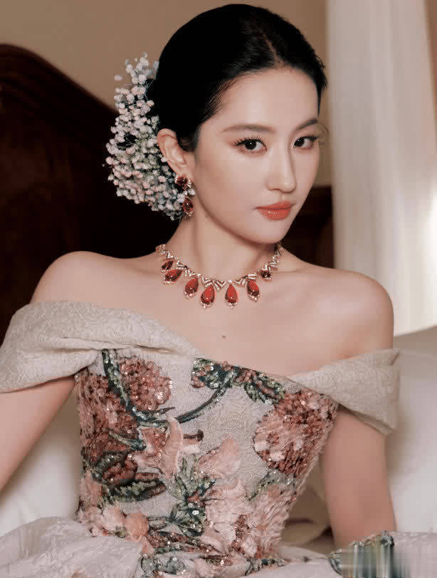 身着繁花刺绣长裙,像是古堡中的女王,红宝石项链与头上的簪花衬托,显得更华丽且高贵。